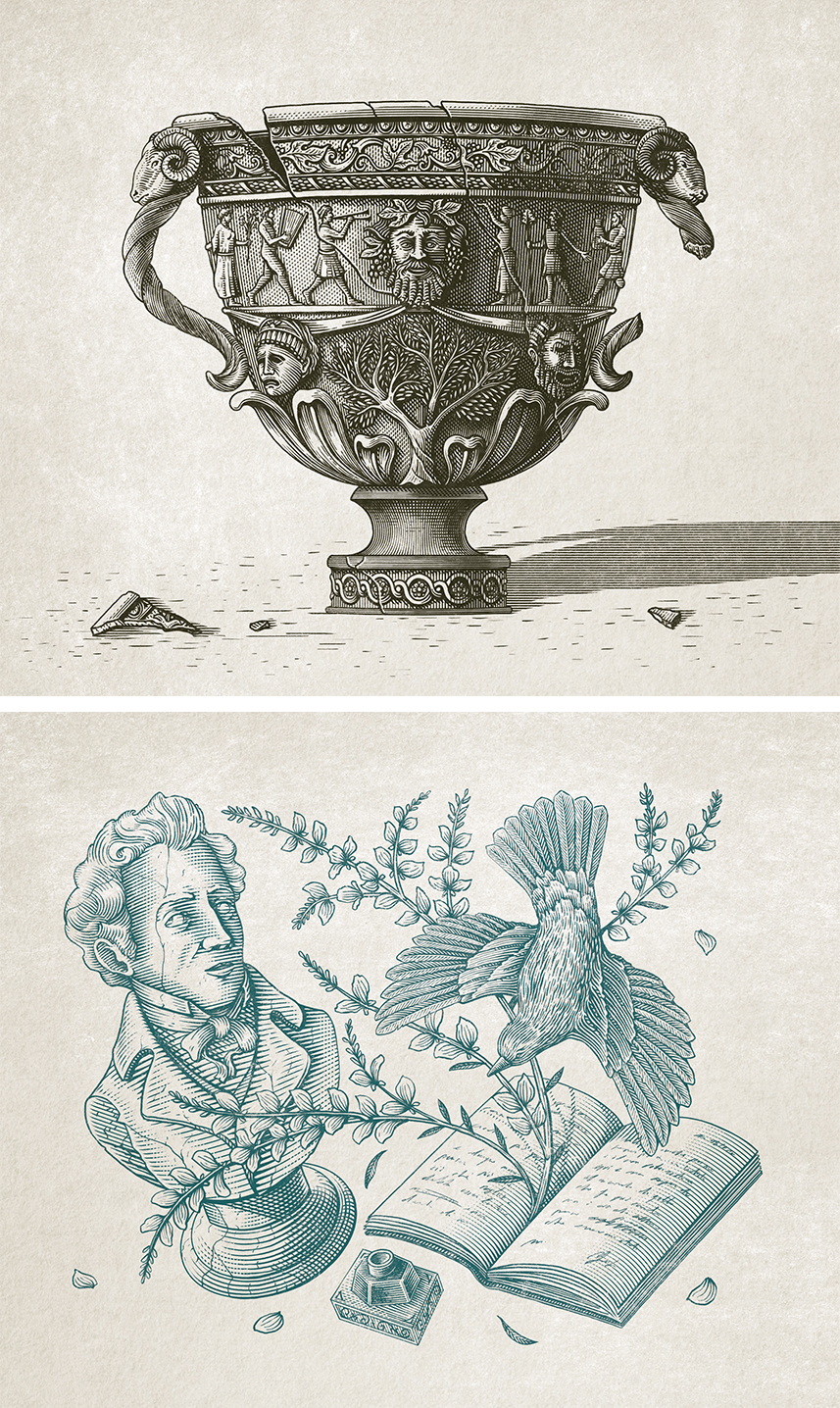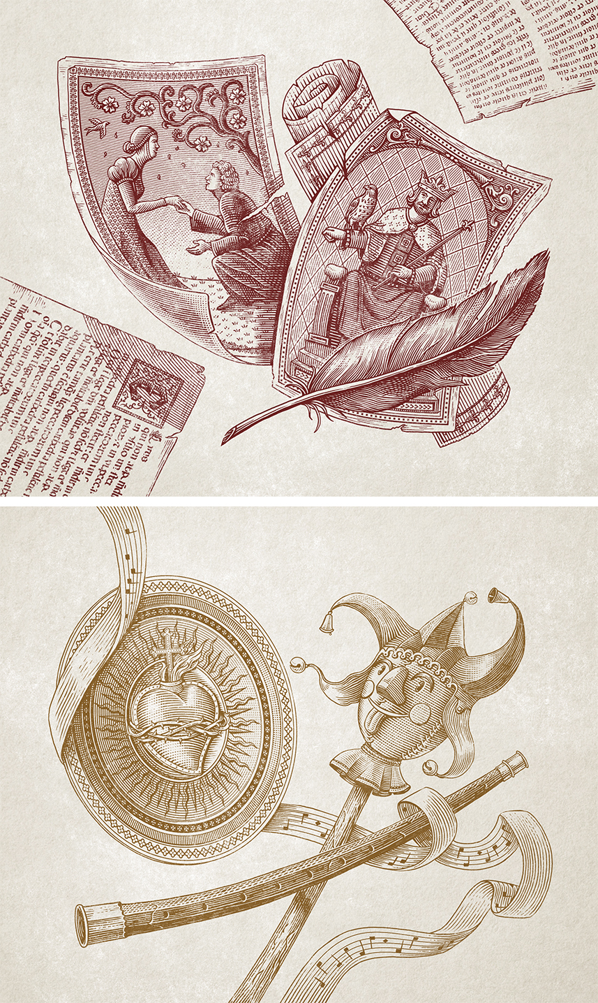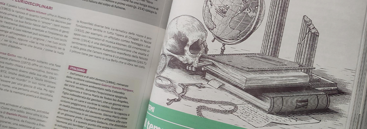 Illustrations for Zanichelli Editore literature school book, about classic poetry and theatre. In order you can see these chapters: the Courtly Lyrics, the Sacred and Profane Poetry, the Tragedy, Giacomo Leopardi, Time and Memory
